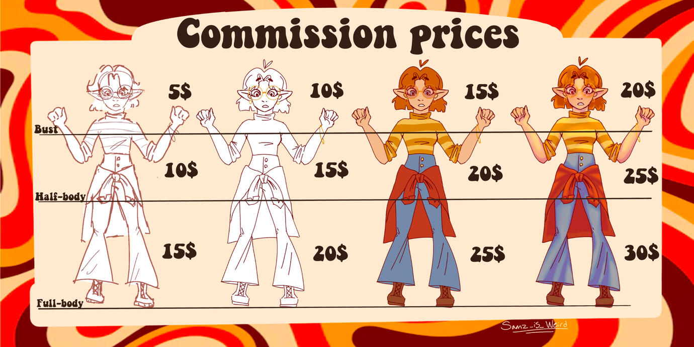 1. GENERAL TERMS* All drawings may or will include a subtle sign that you may not remove.* I might record the drawing process and post it on my social media platforms.* Prices are subject to change based on demand.* I have the right to reject any order that I do not feel comfortable drawing for any reason.2. PAYMENT* Currency accepted is either USD or Danish Kroner and can be paid through PayPal or any Danish payment service such as MobilePay.* Commissions are to be paid 100% upfront. I will not begin the commission until payment is fufilled.* Don't send me any payment before I have agreed to give you a slot and requested you to send me the payment.3. PROCESS AND DELIVERY* I will notify you when I have started on your commission and you, therefore, lose the rights to a refund.* While I'm working on your commission I will make reviews with you to make sure I make it just right for you!* The amount of reviews depends on the complexity of the work.* During the reviews, you will see work-in-progress and these images will usually include a watermark and be smaller than the finished piece.* The time it takes to finish your commission varies 4 days - 2 weeks depending on factors such as health, the complexity of the commissioned piece, other work and exam seasons.* If anything comes up that will slow the progress of the initially estimated delivery time I will let you know asap.* Once the piece is finished you will receive the image via discord or a higher quality one via email.4. REVISIONS* You get 3 rounds of changes on the commissioned piece included in the price.* A fee will be added if you want something changed on the final drawing - unless a misunderstanding from my side has been made.* If you wish for me to change something in the drawing you have previously approved, I will charge you a fee to change it. The amount of the extra charge depends on the change you want me to make.5. COPYRIGHT / USAGE POLICYI, Samzisweird (the artist), claim the rights to the produced drawing, not the buyer. Therefore I am allowed to use the copyrighted artwork to:* Promote myself with it everywhere* Display it everywhere to my liking (website, social media, etc.)* Post it wherever I wantThe buyer is allowed to:* Use the commissioned piece for personal use unless agreed otherwise (you can upload it on all your social media profiles, forums, etc.)* Print the artwork and claim the character(s) as their own, but not the artwork itself.* Use the artwork to promote themselves. You are not forced to give me credit when you post it but it is very appreciated.* Use the artwork on their Youtube channel and in monetized videos as long as the artwork itself is not the main subject for the earnings.The following is considered copyright infringement:* Reproducing/using the copyrighted artwork commercially - means making money off it in any way.* Claiming the artwork as your own* Removing my signature from the artwork* Altering the artwork without my consent* I reserve the full rights to the image and it's use/distribution unless otherwise agreed upon (rights to the image for your own non-personal use may be purchased at any time).6. CUSTOMER SATISFACTION* I will do everything I can to make my customers happy!* If you have a problem with anything in regards to the commissioned piece please tell me right away so we can find a solution together.* I am willing to change some of my terms for you if you ask before I start on your commission. If you, e.g., do not want me to post your art anywhere, we can discuss this.7. REFUND / CANCELLATION POLICY* The buyer is not allowed a refund once I started working on the commission.* If for any reason I am unable to start your commission you will receive a full refund.* If you cancel your order before I started it, you can get a full refund.* If you are getting a refund, do not request a Paypal chargeback. I will transfer the money back to you myself.* If you request a Paypal chargeback at any point when you were not allowed to ask for a refund you will lose all beforementioned rights to the commissioned piece and I will have the full right to profit further from it in any way. I will decline the chargeback and supply Paypal with our conversations in which we talk about the commission as evidence that I have completed work for you. Furthermore, you will be blacklisted for commissioning me again.If the buyer breaks any of the points stated above they will lose all the beforementioned rights to the artwork commissioned by me, Nadia Axel (the artist), and I will have the right to profit further from the commissioned artwork in any way I see fit. If you have a problem with any of these statements, they may be changed if discussed with me prior to paying your commissioned piece.